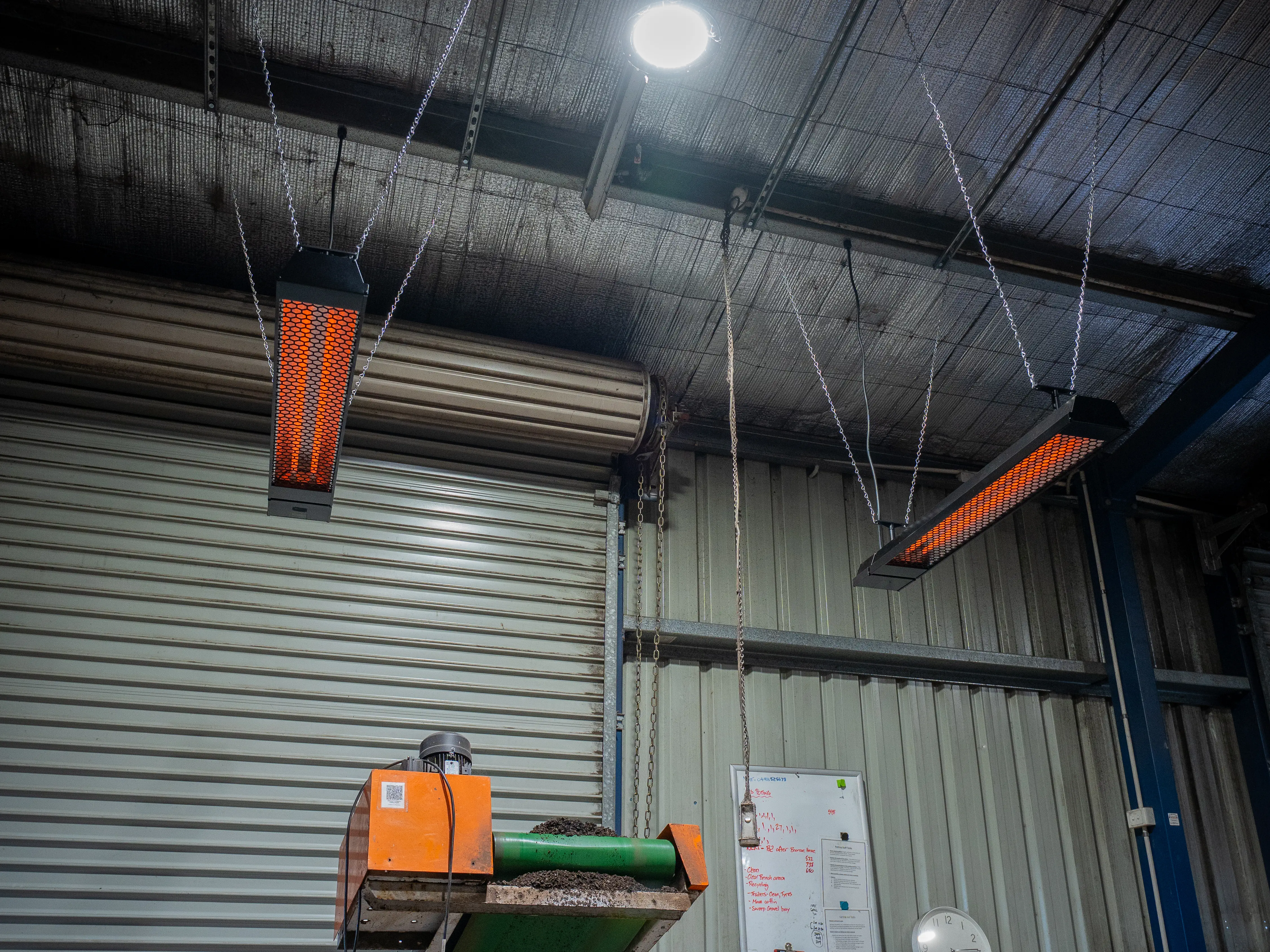 Infrared heaters warm people and surfaces directly instead of heating the air, making them ideal for open or semi-open environments where warm air dissipates quickly. This ensures staff feel warm even when cold air is circulating through the shed.