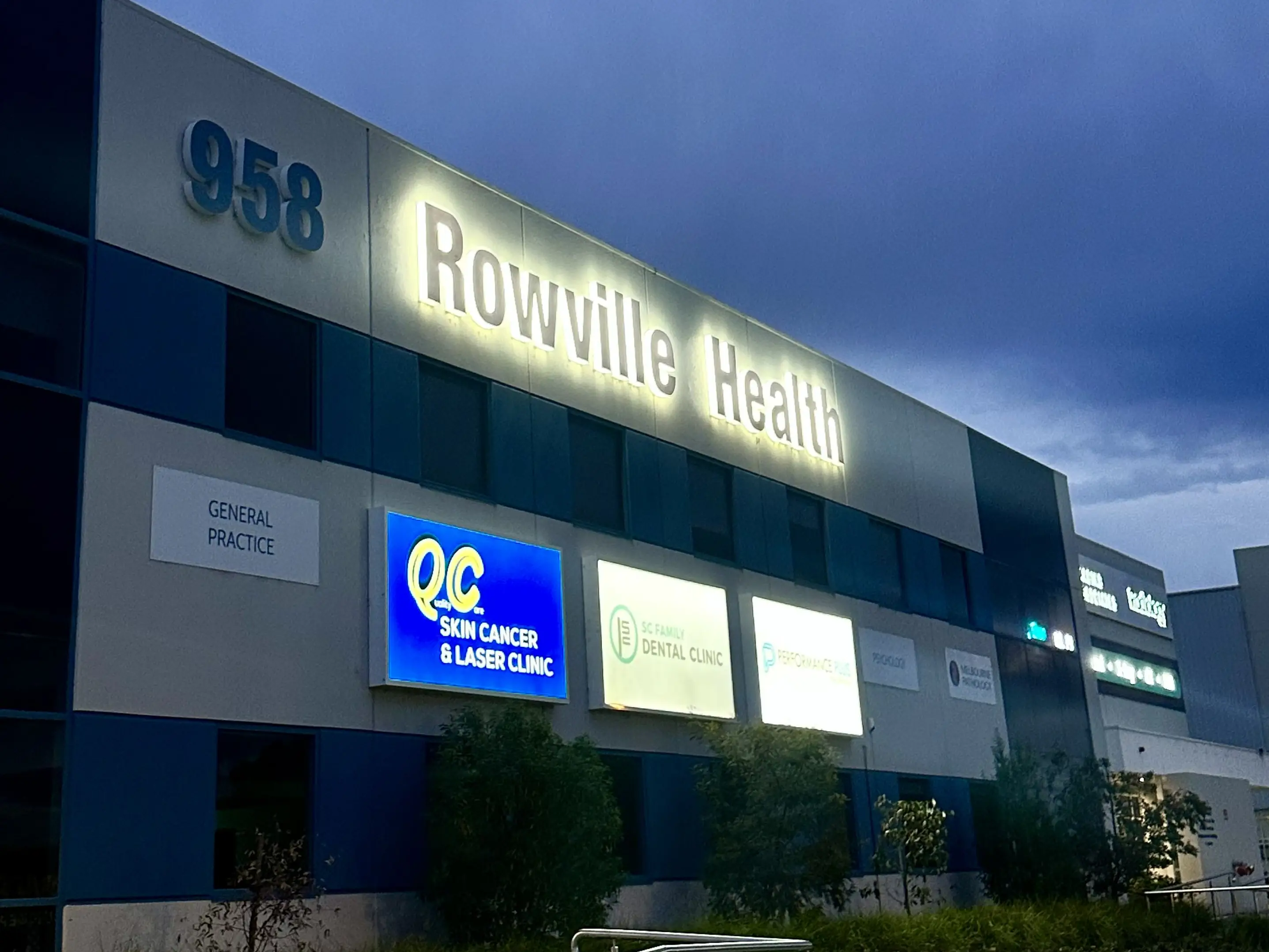 Rowville Health wanted the clinic to stand out after sunset and be easy to spot from nearby arterial roads. Evening arrivals were finding the building hard to pick out. Illuminated signage was selected to improve visibility and create a more welcoming entry for late appointments.
